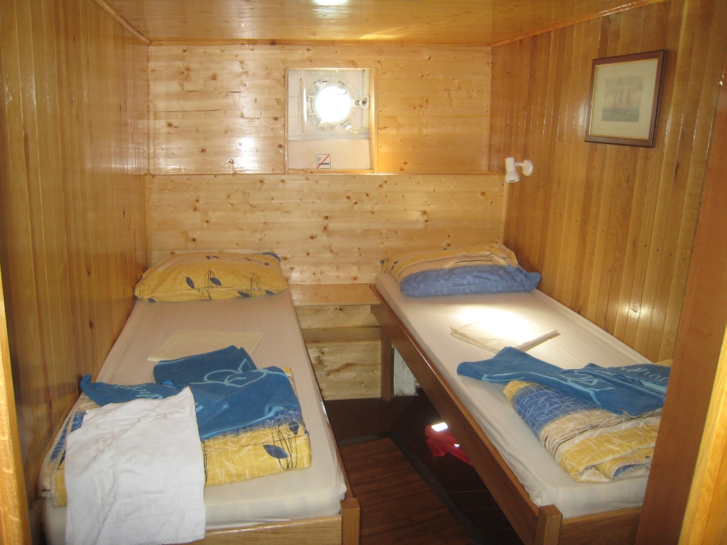 Captain Damir’s Linda is a spacious wooden motor yacht. She was built in 1955 and renovated in 2004/2005 to meet the requirements of Islandhopping. 102 ft./ 31 meters long and 19,5 ft./ 6 meters wide the Linda is among the bigger ships in our Croatian fleet. The spacious saloon can accommodate 32 guests, and the middle sundeck is constructed in a way that meals can also be served outside. The upper deck measures 131 sq ft./ 40 square meters and is big enough for sunbathing. Three cozy cabins below deck are equipped with separate beds and two portholes each. Another one has got a double bed with an additional bunk bed above the large bed, so that they can also be booked by three persons. On deck there are ten double cabins. Six of those have a double bed and four double cabins are equipped with separate beds. Captain Damir and his crew look forward to welcome our guests on board of their Linda. All cabins have air condition.